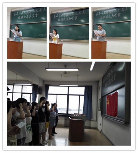 接着,由优秀的毕业生党员代表发言交流,他们即将离开母校,毕业生党员代表们言辞间无不流露出对母校的眷恋、对老师的感激和对未来的憧憬之情。已经考取选调生即将到基层工作的姜雪在发言中谈到,在实习、准备选调生考试的过程中,充分体会到了习近平总书记的讲话的精神实质,以党的理论知识为导向,以专业知识为基础,注重理论与实践的结合,在今后扎实的工作中不断历练党性修养和业务素质,为实现中国梦贡献自己的力量;参加志愿服务西部到新疆去工作的耿浩强同学激动的说到,当听到招录内地优秀毕业生到新疆工作这一消息时,感觉自己为中华之崛起的理想与梦想就要实现了。看到通知后,自己就毅然响应党的号召报名参加。到祖国最需要的地方挥洒自己的青春与热血;考取研究生的毕业生党员邢新敏、原校学生会主席郭康也做了交流发言。最后,支部全体成员面向党旗,重温了入党宣誓。