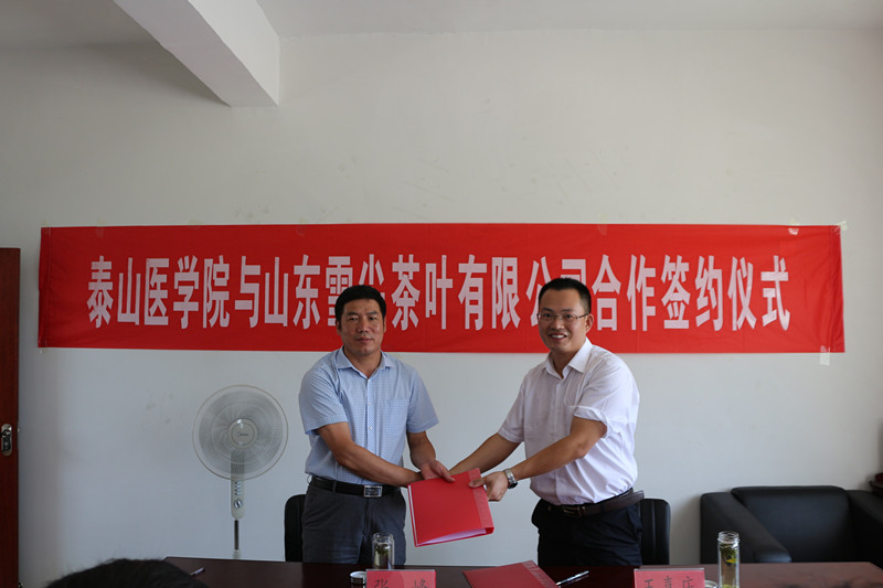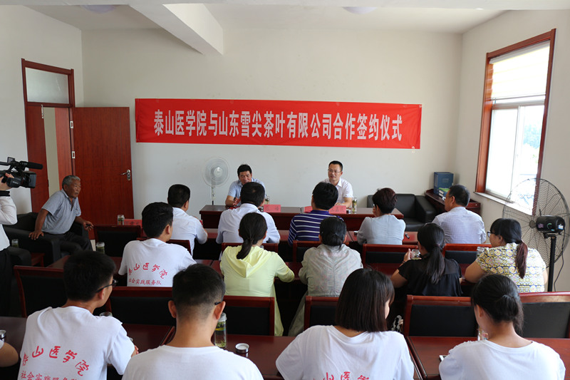 接着,社会实践服务团来到山东雪尖茶业有限公司。山东雪尖茶业有限公司与十大买球官方网站在营销管理培训、科技扶贫、智力支持等方面达成合作意向,学院党委书记张峰与山东雪尖茶业有限公司销售部经理王嘉庆签署了合作协议。