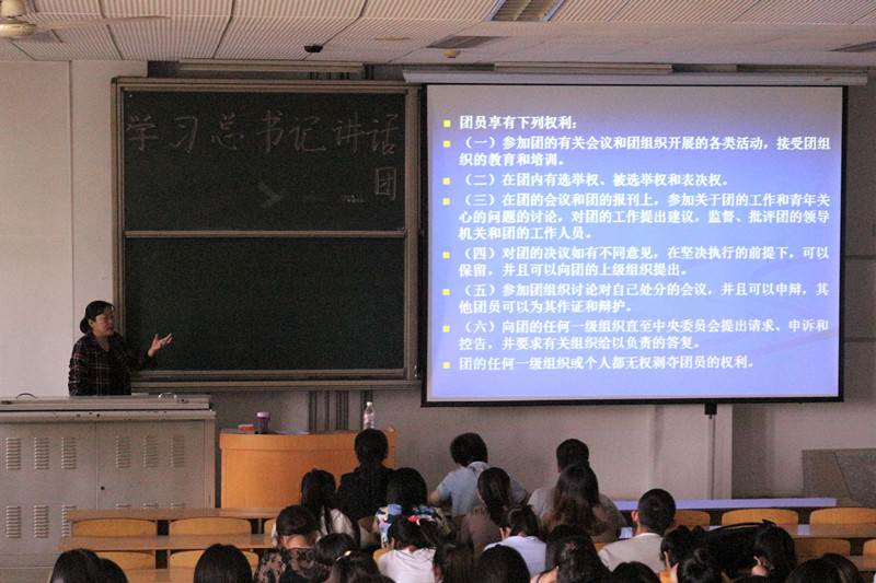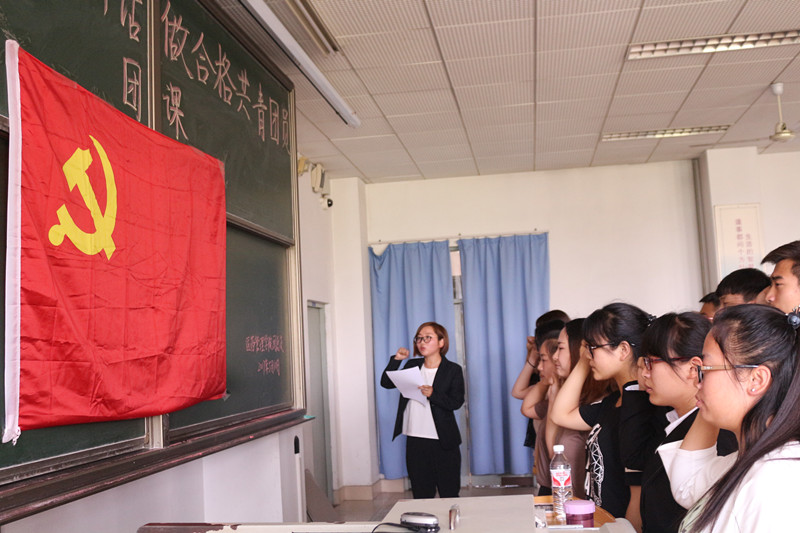 根据校团委《关于在全体团员青年中开展“学习习近平总书记讲话 做合格共青团员”教育实践的工作方案》有关要求,在学院分党委的指导下,学院团总支陆续组织开展了上团课、重温入团誓词、主题团日等系列活动。 5月10日下午在校本部教学南楼C1001举行了重温入团誓词、上团课的活动,本次团课由学院团总支书记胡华秀老师主讲。 雄壮的国歌之后,全体共青团员在团员代表张卓的带领下重温了入团誓词,然后由优秀团员代表韩美玉分享了自己的学习体会,她谈到作为一名共青团员,应该在学习、工作、生活中时刻发挥自己的先锋模范带头作用,从思想上端正身为团员的责任意识和正确态度,不断的提高自身的综合素质。 随后,胡华秀老师给全体共青团员做了“学习习近平总书记讲话,做合格共青团员”的团课,胡老师分别从2016年8月中共中央办公厅下发的《共青团中央改革方案》、共青团的发展历史、团支部自身建设以及助力学生成长成才提供锻炼和发展的四个平台建设等四个方面进行讲授,最后对团员青年提出了具体的要求,希望大家一定要以“学习习近平总书记讲话,做合格共青团员”为契机,深入学习团的理论知识,善于实践,生活中真正起到模范带头作用。特别是团支部委员会成员要认真思考在整个“一学一做”教育实践活动中应充分发挥自身职能,积极引导广大共青团员坚定共产主义理想信念,坚决拥护党的路线方针政策,听党话、跟党走,做一名合格共青团员。 共青团员“一学一做”教育实践活动,有利于引导团员积极践行社会主义核心价值观,学习传承中华优秀传统文化,有利于增强团员意识,强化组织意识和组织纪律,同时对于加强学生的思想政治教育、提高综合素质有重要意义。