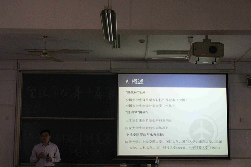 崔行武老师对“挑战杯”竞赛的形式、比赛办法、我校“挑战杯”赛的发展历程、团队构成要素、作品形成以及项目选取方向等进行了全面的分析和指导。他提出竞 赛项目的选取和团队构建是参赛的基础,项目选取是参赛成功与否的关键,要求同学们必须重视这两个环节,并通过案例分析演示给同学们商业计划书的撰写方法。 此外,崔老师结合自己的指导大学生参加“挑战杯”的心路历程,鼓励同学们积极参加竞赛活动。