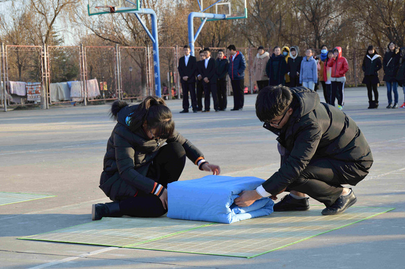 叠被大赛中,各参赛专业班级代表按照要求在规定区域将揉乱的棉被放在凉席上。比赛中,各参赛选手按照军训时教官的要求,熟练的将被子叠成“豆腐块”形状, 四四方方、有棱有角。赛中的选手争分夺秒,围观的同学也是连连叫好。各评委本着公平公正的原则对同学们的成果进行了打分,并评出了一二三等奖。