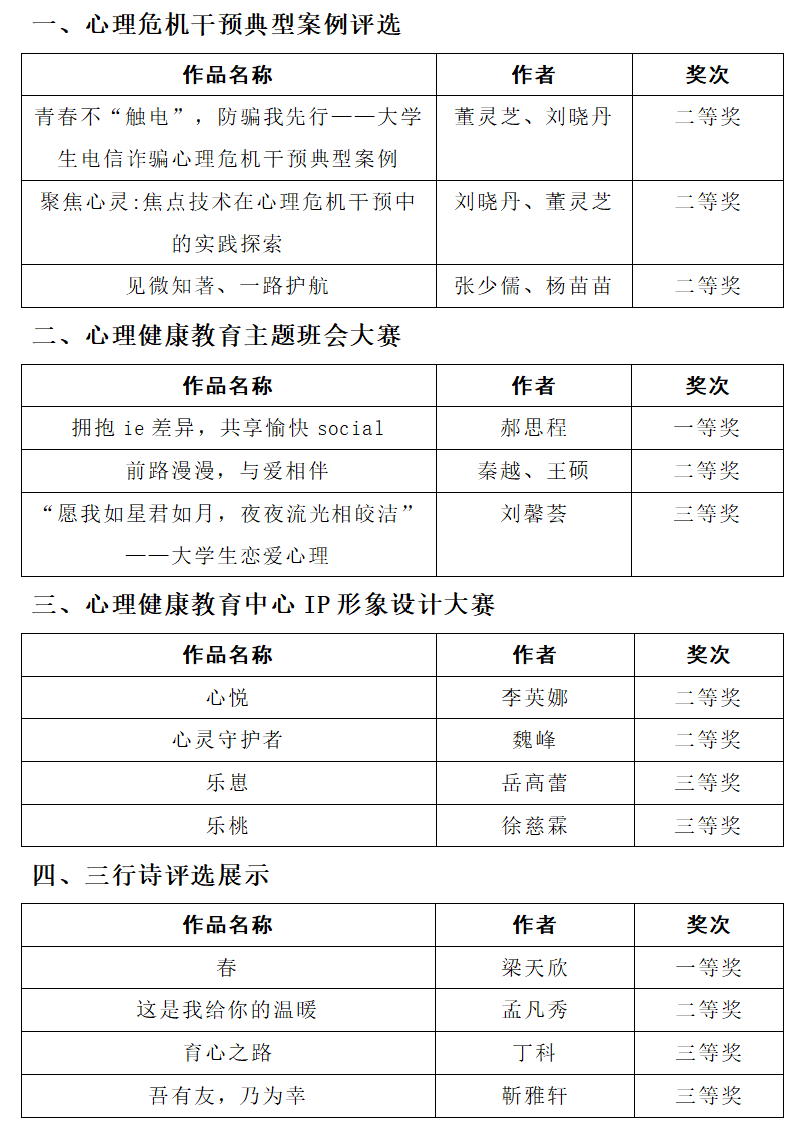 近日,校(院)2024年心理健康教育月展示活动评选结果正式公布,十大买球官方网站在心理危机干预典型案例、心理健康教育主题班会、心理健康教育中心IP形象设计大赛、“这是我给你的温暖”三行诗评选展示等四个项目中荣获多项奖项。