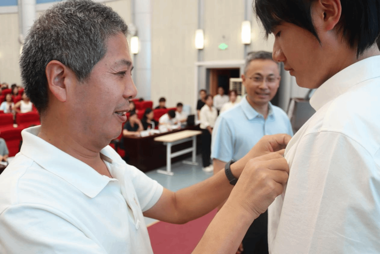 杜江山、陈士福为 2024 级新生佩戴院徽,向新生同学们表达了真诚的祝愿和满满的期望。