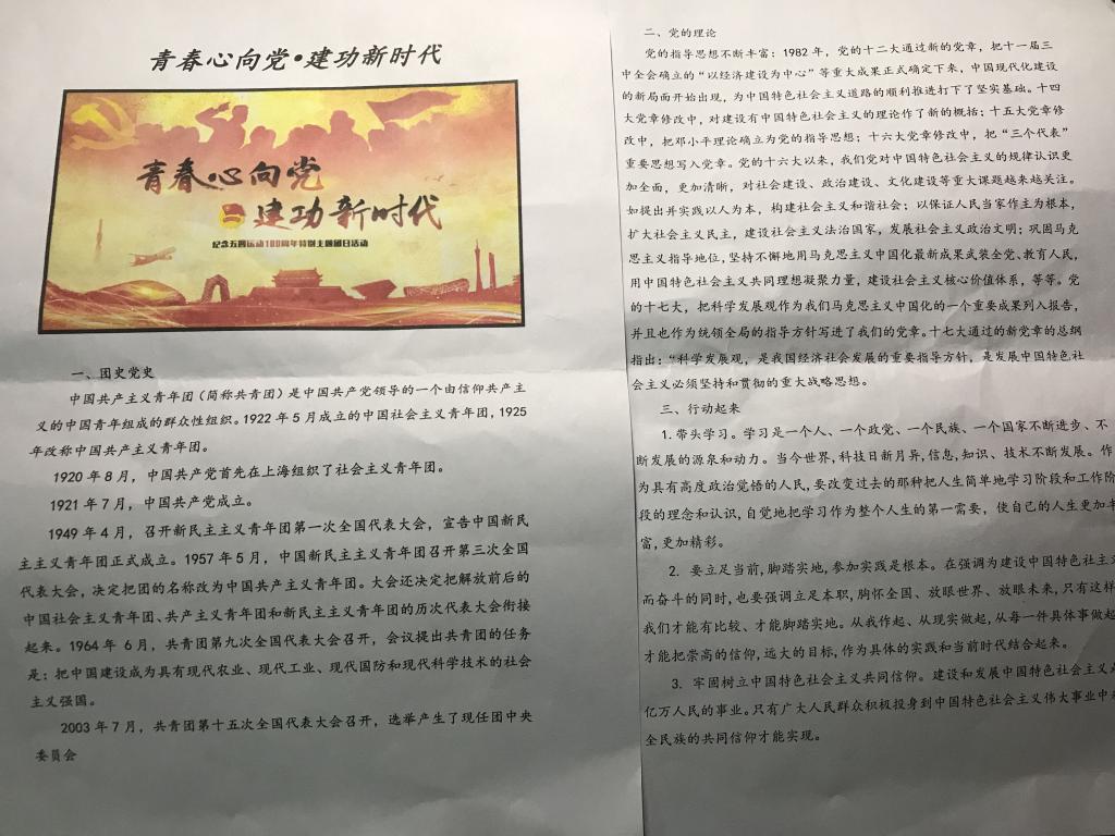 为纪念五四运动,传承五四精神,根据团中央和校团委的要求,从4月中旬开始,十大买球官方网站各级团支部陆续开展了“青春心向党 建功新时代”纪念五四运动100周年特别主题团日活动,通过多种形式学习并传承五四爱国精神。