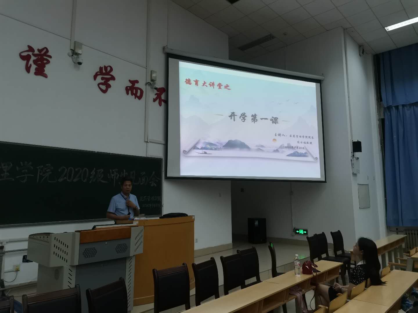 首先,党委书记贺兆涛代表全院师生对2020级新同学致贺辞,他说,新生在学习方面应学好专业知识为以后的发展夯实基础,要放大格局、开阔眼界,学习泰山“挑山工”的攀登精神。在工作生活方面,既要有团队协作精神,也要有身心的磨练永保健康,要磨练意志、志存高远,要有家国情怀、学会担当。贺兆涛还和新生一起学习共勉了总书记在抗疫总结表彰大会上的一段话,表示青年一代应该不怕苦、不畏难、不惧牺牲,用臂膀扛起如山的责任,展现出青春激昂的风采。