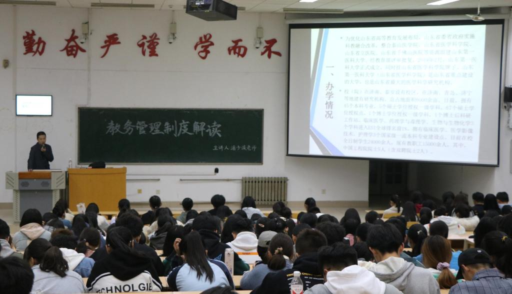 教务部副部长潘少波于10月23日主讲了“教育管理制度解读”讲座。潘少波首先就学校的办学情况、学院与专业、教务部职责三个方面进行了讲解,介绍了学校的基本情况。随后潘少波还为新生讲解了学校的学籍和学分制度、学业警示制度、学位授予条例等,解答了部分同学关于辅修的疑问,激励同学们努力学习。