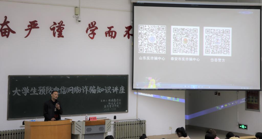 11月4日下午,泰安市岱岳区公安局办公室主任张瑞鑫、泰安市公安局岱岳分局刑侦大队民警郑元民来我校,分别为同学们作了大学生预防电信(网络)诈骗和终结诈骗知识讲座,从什么是电信网络诈骗、大学生的网络诈骗形式、如何防范网络诈骗、补救措施四个方面向同学们进行了分析,讲座结合着岱岳区近年来电信诈骗案件的数据进行讲解,此次报告会警示性强、教育性强、实用性强,让同学们深刻认识到网络电信诈骗活动的巨大危害,强化了防电信诈骗的意识,提高了十大买球官网学生规避风险的能力。