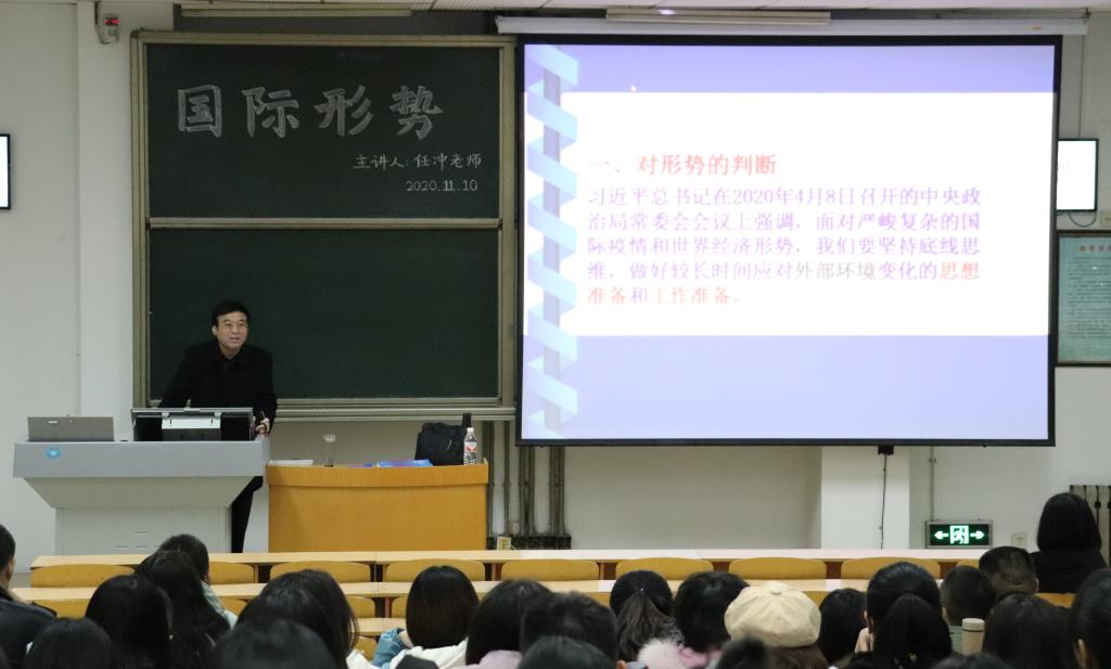 11月10日晚,十大买球官方网站党委邀请马克思主义学院任冲教授在教学南楼C1002教室为十大买球官方网站入党积极分子作关于当前国际形势的报告。