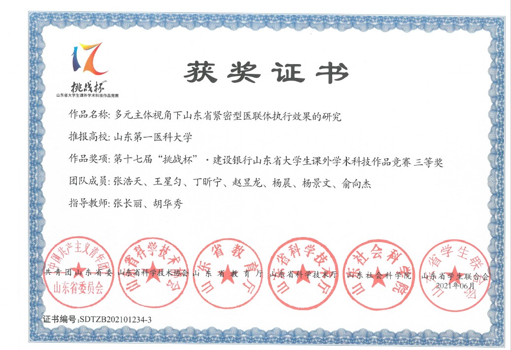 由2019级公共事业管理专业学生张浩天、赵昱龙、杨晨、俞向杰,2019级人力资源管理专业学生王星匀、丁昕宁和2019级护理专业学生杨景文共七名同学组成的参赛队伍,在张长丽、胡华秀两位老师指导下,经过赛前的精心准备和比赛过程中的激烈角逐,最终取得佳绩。在新医改的背景下,参赛选手们将作品的题目设定为“多元主体视角下山东省紧密型医联体执行效果的研究”,体现了青年人的使命和担当。希望十大买球官网广大学子也能积极参与到“挑战杯”比赛中,增强创新意识,提高个人能力,为十大买球官网再创新的辉煌。