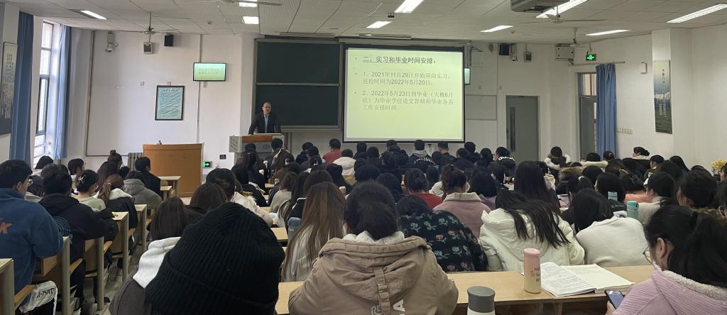 会上,陈海玉分析了近年来毕业生的就业趋势,强调毕业生应树立正确的择业观和就业观,学会科学、合理、灵活的规划自己的职业生涯,对毕业生在实习前必备的材料、毕业学位论文撰写以及《实习报告手册》填写的注意事项及实习安全等方面做出详细的解读和指导。陈海玉强调:“现在哪里不重要,关键你要去哪里”,希望毕业生们认真完成自己的实习,谨慎选择自己的就业方向,顺利就业。
