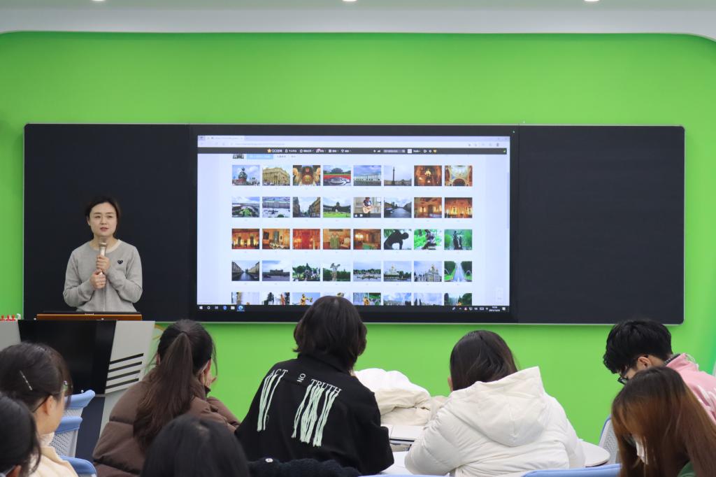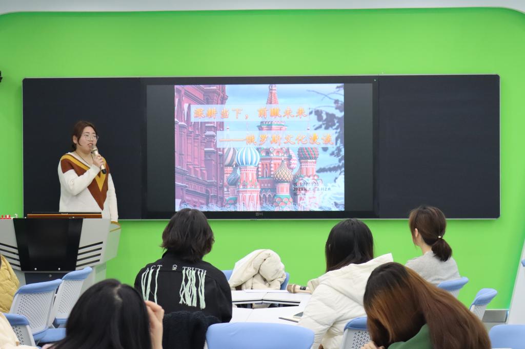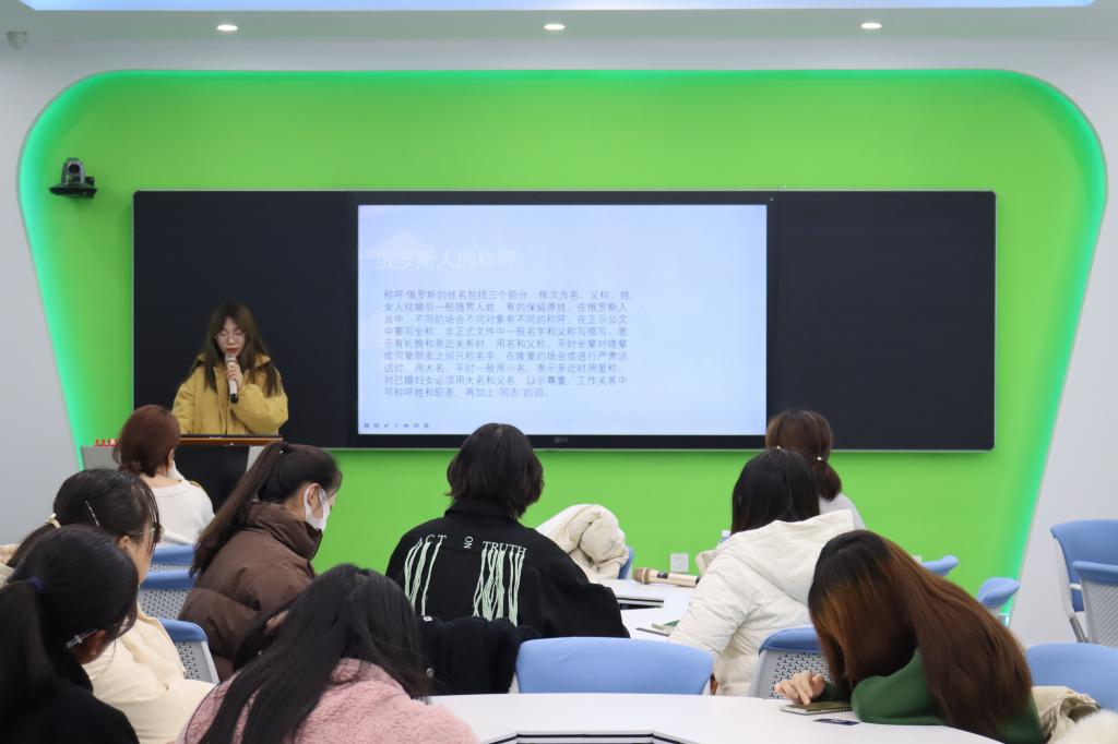 随后,高娟为大家讲述了俄罗斯文化知识与风俗习惯,以平易近人的语气,幽默的表达方式向同学们介绍了俄罗斯的各种节日,如女王节、谢肉节等,还从俄罗斯的著名景点、圣物、亲吻礼节和俄罗斯的烟酒食物等多方面展示俄罗斯文化。最后,高老师分享了她在俄罗斯的学习经历,吸引了在场同学们的兴趣。
