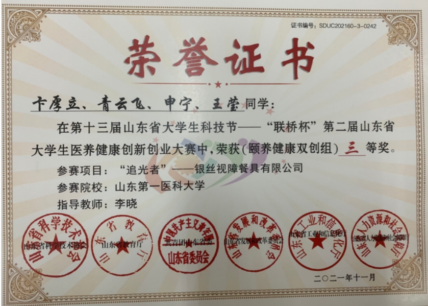 其中,由张长丽、王爱敏老师指导、杨菲菲、于怡、肖菲、梁子璇、向荣江同学的参赛项目《宇创智慧居家养老服务公司策划书》获得二等奖,由袁飞、张国勇老师指导、赵旭阳、宋鑫、刘钰娜、臧婧羽、王康安同学的参赛项目《大学生健康管理app》获得三等奖,由李晓老师指导、卞厚立、青云飞、申宁、王莹同学的参赛项目《“追光者”——银丝视障餐具有限公司》获得三等奖,由李萍、鞠迎修老师指导、徐英翔、许怡冉、张煜佳、夏金燕、陈翠茹同学的参赛项目《舒美˙康体盆底康复技术有限责任公司》获得三等奖。