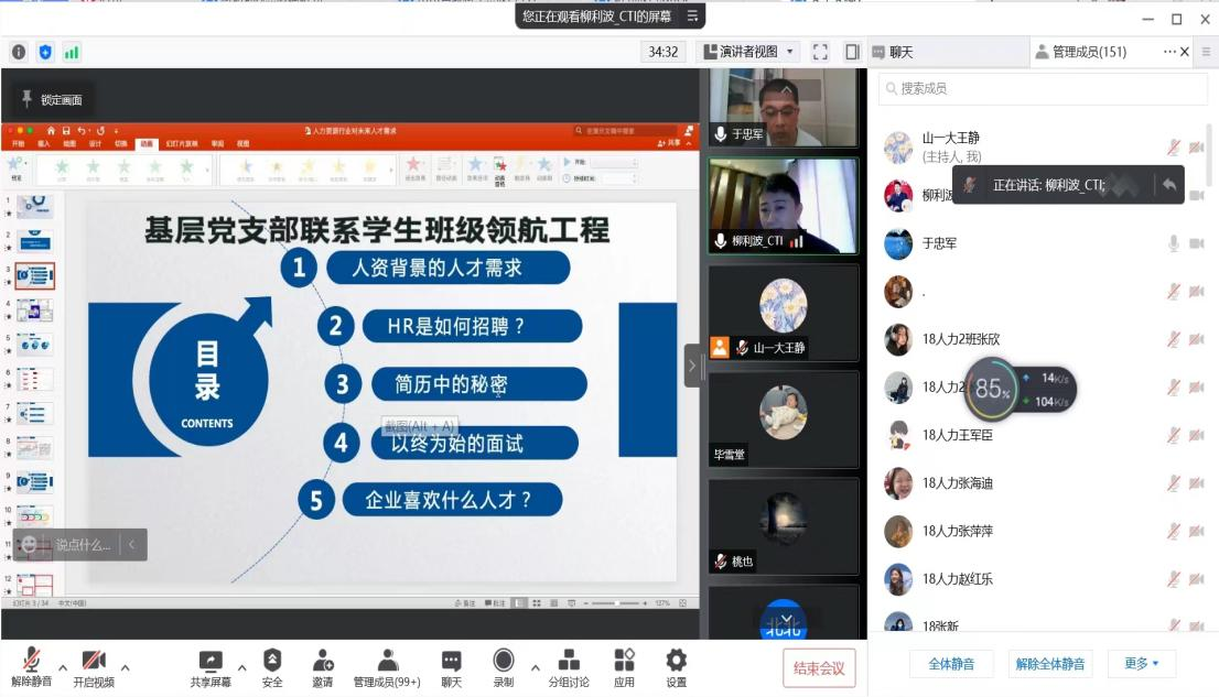 王静首先向同学们简要介绍了校(院)党委实施基层党支部联系学生班级“领航工程”的目的与意义;人力资源系于忠军主任强调了作为HR了解行业发展趋势的重要性。