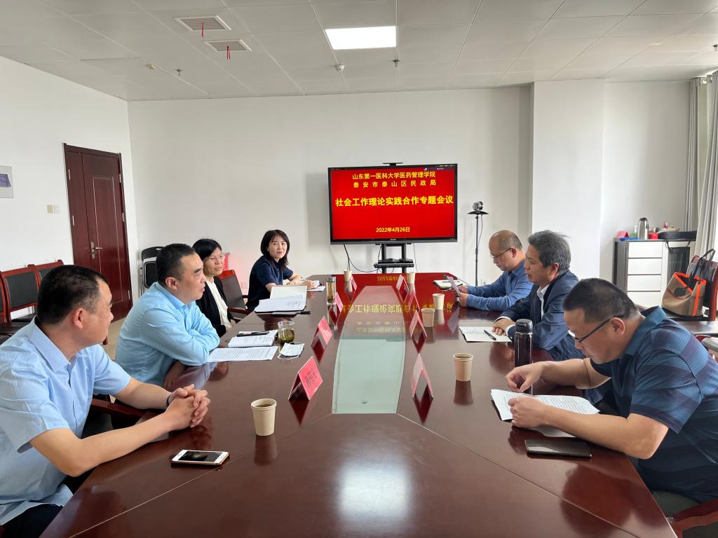 泰山区民政局局长李惠清主持座谈,副局长何加松介绍了泰山区基层治理及社会工作开展情况,孙奎立介绍了我校社会工作专业及人才培养的基本情况,陈士福对学院的发展及实践教学现状作了介绍。随后,双方就协同优势,资源共享,实践教学、人才交流与培训、发展规划与决策咨询、理论实践创新、实践基地共建等方面达成初步意向。
