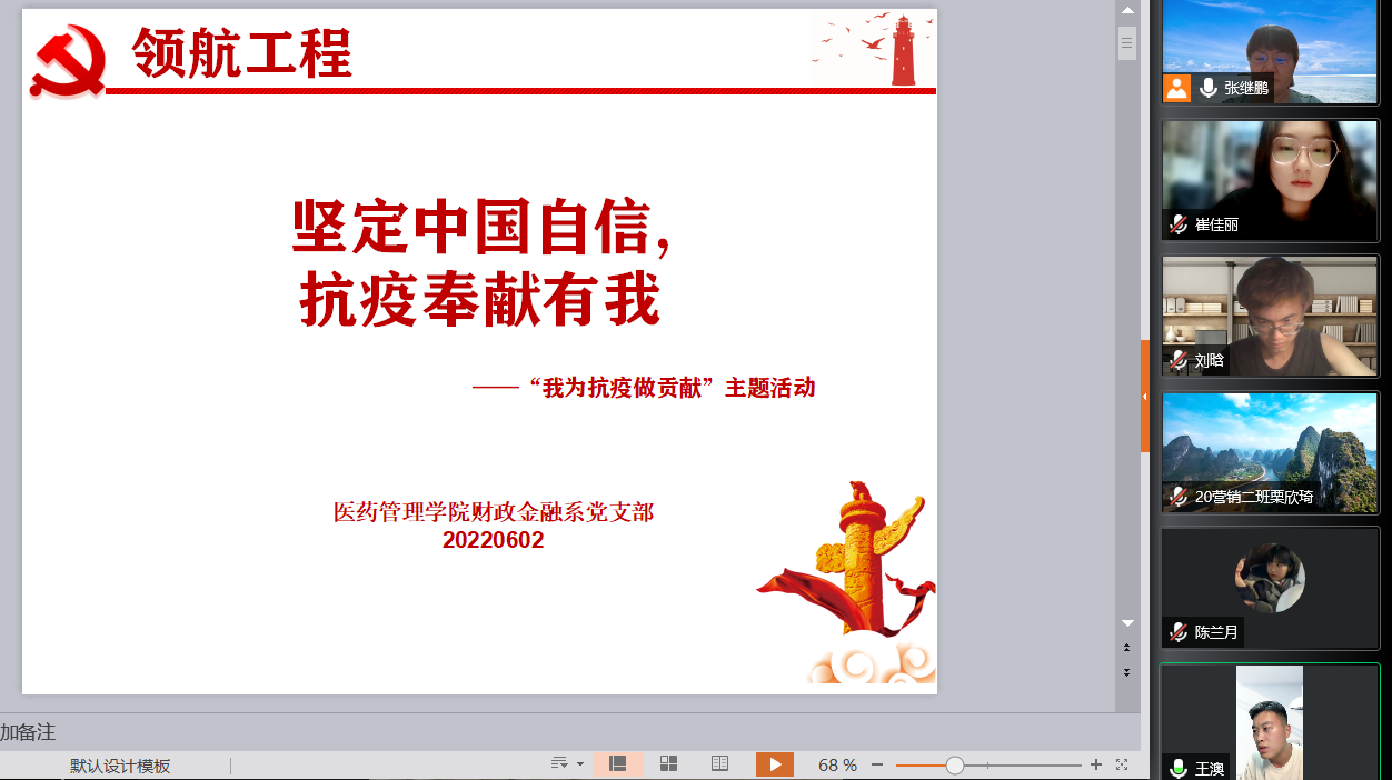6月2日,十大买球官方网站财政金融系党支部通过线上方式与2020级市场营销专业本科2班全体同学开展了“坚定中国自信,抗疫奉献有我”——“我为抗疫做贡献”主题活动。