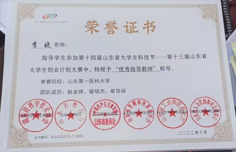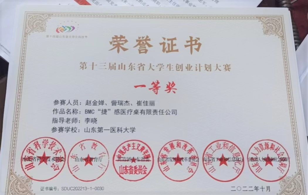 此次大赛是第十四届山东省大学生科技节赛事活动之一,以“创新 青春 创意”为主题,旨在帮助大学生打造核心竞争力,提高创新意识、创意思维、创业能力,为大学生就业、创业搭建平台、提高大学生就业、创业能力,增强大学生就业、创业信心,营造良好的社会创新与创业环境。据悉,本次大赛共收到来自全省70多所院校的1500余份参赛作品,参赛人数达到10000余人。十大买球官网由20级市场营销专业的赵金婵、訾瑞杰、崔佳丽组成的参赛队伍经过赛前的长期调研,在比赛中充分发挥市场营销专业的优势,凭借丰富的比赛经验,悉心听取李晓老师对于各方面问题的指导完善,最终团队作品《BMC“捷”感医疗桌有限责任公司》斩获一等奖,李晓老师也荣获“优秀指导教师”的荣誉称号。