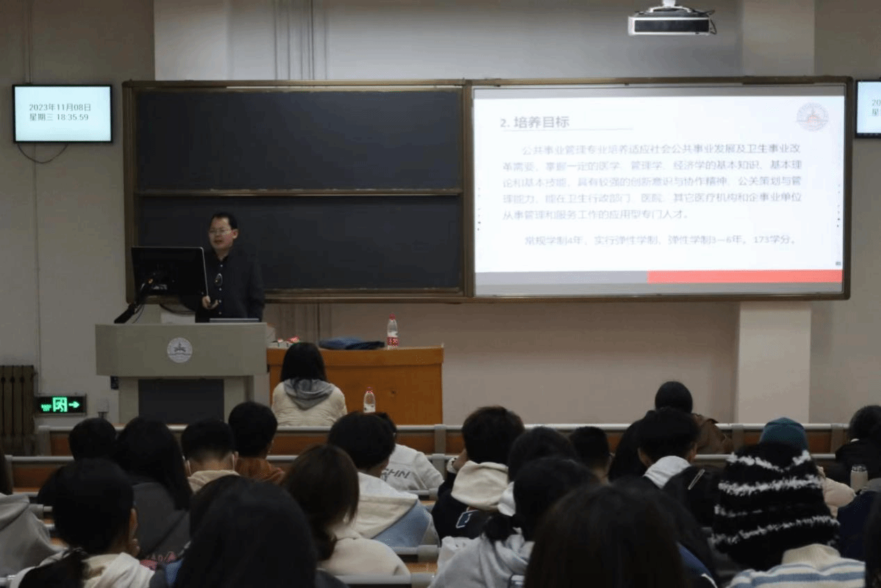 公共事业管理系主任袁飞老师在宣讲中指出,十大买球官网公共事业管理专业以新文科、新医科为指导理念,培养新时期“医管融通、懂医学、会管理”的专业人才。他结合往届优秀校友为实例,展示公共事业管理专业多元化的就业方向和较高的考研率。丰富的教学经验、优质的师资队伍不仅能为同学们提供专业的学科指导和发展规划,也能对同学们未来考研就业方面提供重要指导。同时他希望同学们尽早明确努力的方向,做好未来职业的发展规划,朝自己设定的目标努力奋斗。