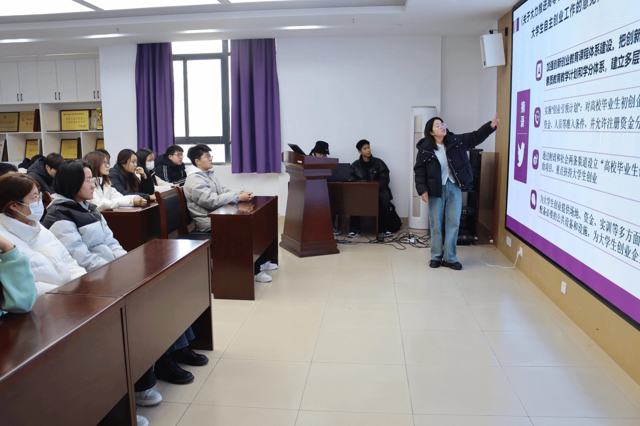 最后,辅导员杨苗苗为学生骨干进行了创新创业培训,详细讲解了近年来针对大学生创新创业的相关国家政策,强调新时代大学生要立足当下,脚踏实地,学习真实有益的创新创业方法,待到真正走入社会后,也要接续奋进、不断学习,在磨砺中绽放出绚丽的青春之花。