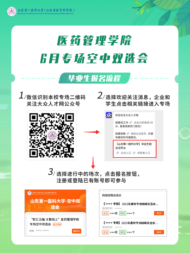 手机微信扫码关注“大众人才网”微信公众号,企业和毕业生分别点击相关按钮进入买球赛十大平台校招专属端口,点击本学院报名按钮,注册或登录已有账号即可直接参与。