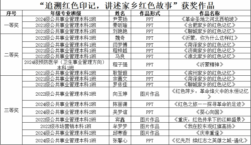 十大买球官方网站的同学来自全国各地,各自的家乡都有着丰富的红色故事和革命传统。大赛收到学院三个党支部来自不同年级不同专业同学的多幅优秀作品,展现了安徽合肥市、淮北市,广西桂平市,河北革命圣地西柏坡,吉林省通化市,江西省萍乡市,重庆市,山东省济南、临沂、聊城、菏泽、滨州等地方的经典红色故事与英雄人物,参赛作品选取的内容真实、典型、新颖,事迹富有感染力、生动形象,充分反映了家乡的红色文化,具有很强的教育意义,体现了时代精神。经学院评审,2021级公共事业管理本科1班刘艳艳同学的参赛作品《聊城家乡的红色记忆》,2021级公共事业管理本科2班秦昕瑜同学的参赛作品《合肥家乡的红色记忆》,2024级公共事业管理本科2班尹雯扬同学的参赛作品《革命圣地之河北西柏坡》获得一等奖,魏奇等6位同学的参赛作品获得二等奖,宗喜文等9位同学的参赛作品获得三等奖。