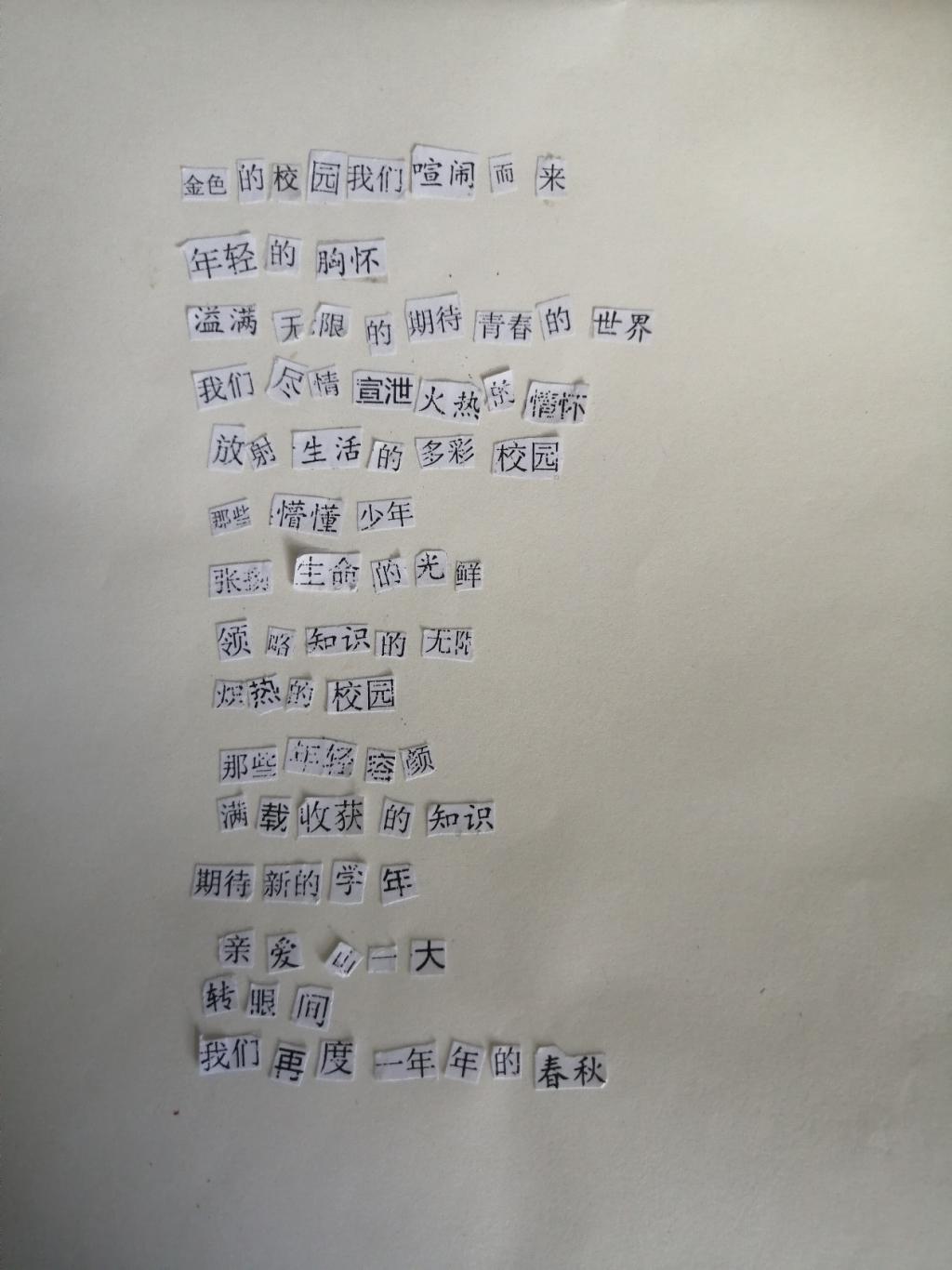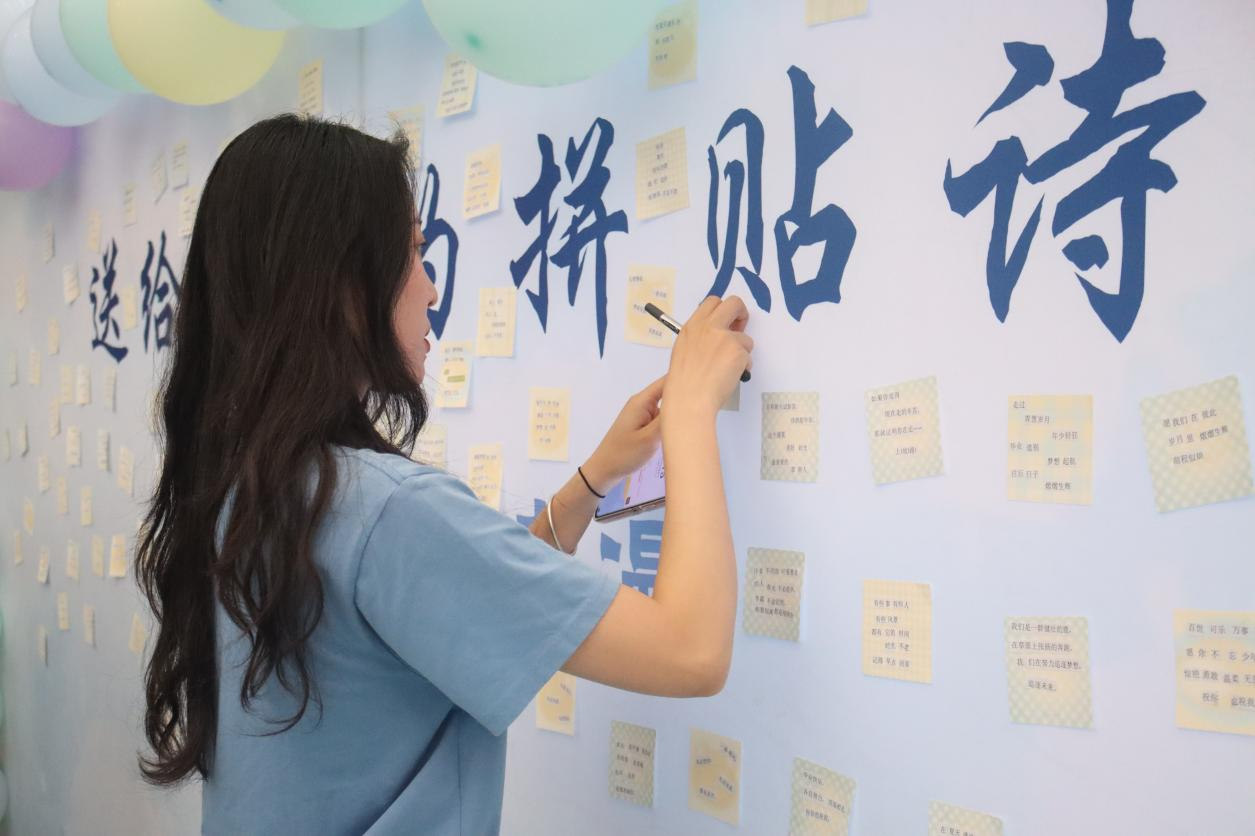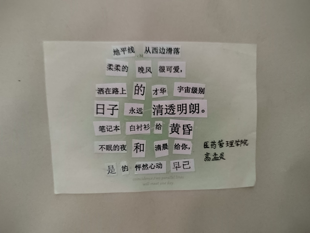 十多天的活动进行过程中,不断吸引着志趣相投的同学们,他们尽情挥舞着手中的文字素材和剪刀,展现着自己独特的灵感与构思,用一个个跳动的文字拼凑出浪漫的诗词,创意十足……整个活动现场氛围活跃,创作者洋溢着热情的喜悦,吸引了众多同学驻足观看。