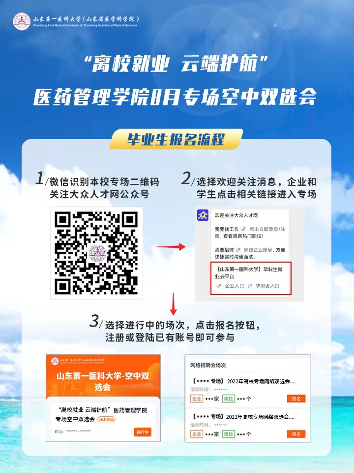 手机微信扫码关注“大众人才网”微信公众号,企业和毕业生分别点击相关按钮进入买球赛十大平台校招专属端口,点击本学院报名按钮,注册或登录已有账号即可直接参与。