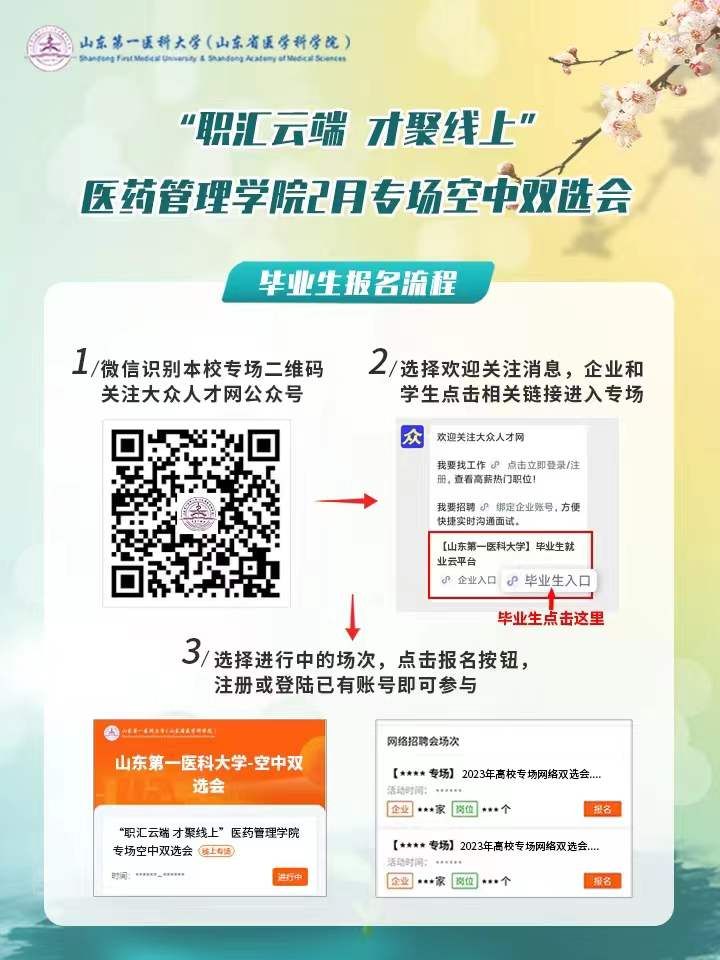 手机微信扫码关注“大众人才网”微信公众号,企业和毕业生分别点击相关按钮进入买球赛十大平台校招专属端口,点击本学院报名按钮,注册或登录已有账号即可直接参与。