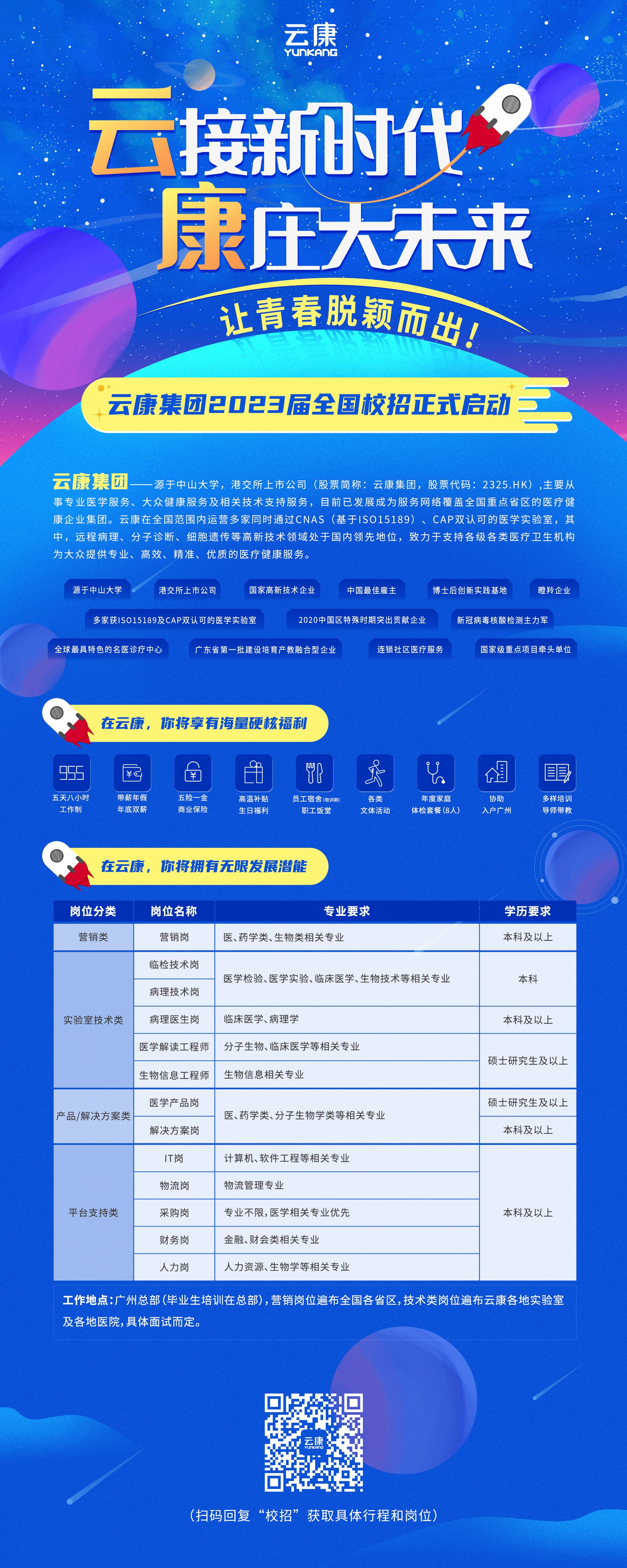工作地点:广州总部(毕业生培训在总部),技术类岗位遍布云康各地实验室及各地医院,具体面试而定。