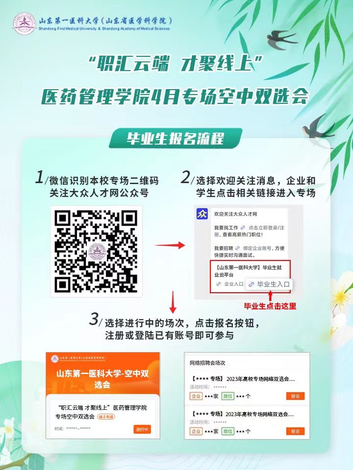 手机微信扫码关注“大众人才网”微信公众号,企业和毕业生分别点击相关按钮进入买球赛十大平台校招专属端口,点击本学院报名按钮,注册或登录已有账号即可直接参与。