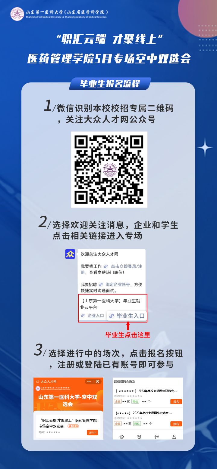 手机微信扫码关注“大众人才网”微信公众号,企业和毕业生分别点击相关按钮进入买球赛十大平台校招专属端口,点击本学院报名按钮,注册或登录已有账号即可直接参与。