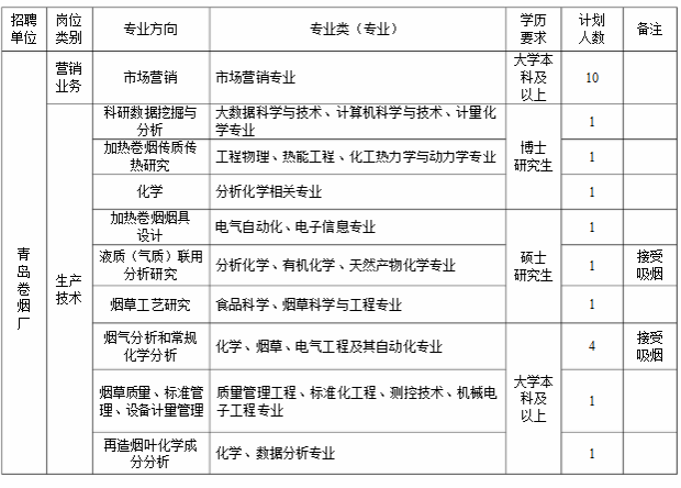 山东中烟工业有限责任公司成立于 2004年2月,是中国烟草总公司的全资子公司,是中央驻鲁国有大型企业。青岛卷烟厂是山东中烟工业有限责任公司下辖的直属非法人卷烟厂,始建于 1919 年,厂区占地 546 亩。根据企业发展需要,现面向社会公开招聘工作人员。具体情况如下: