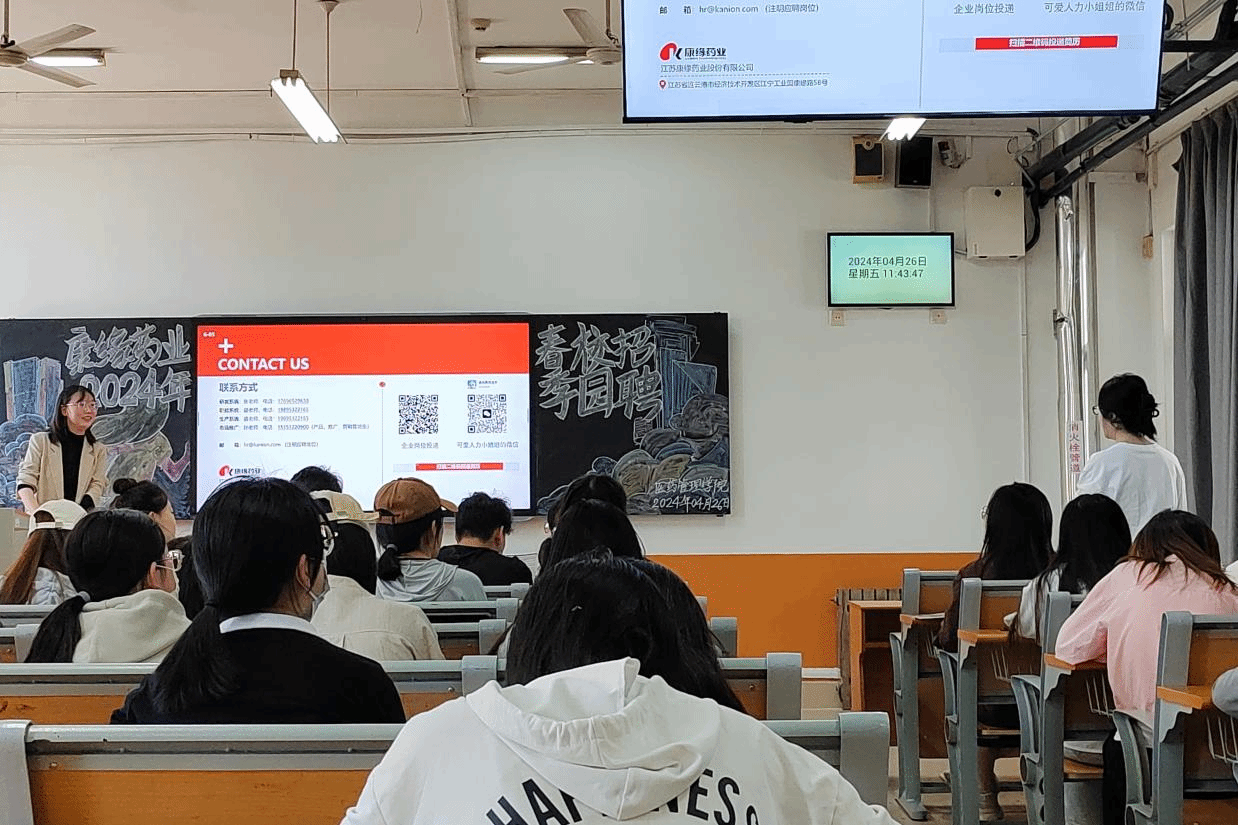 为促进2024届毕业生高质量就业,4月26日上午,康缘药业股份有限公司来十大买球官网于教学楼南C2004举办专场校园招聘宣讲会。康缘药业人力资源部经理蒋明明,学院学工办主任董灵芝、辅导员杨苗苗老师出席宣讲会。