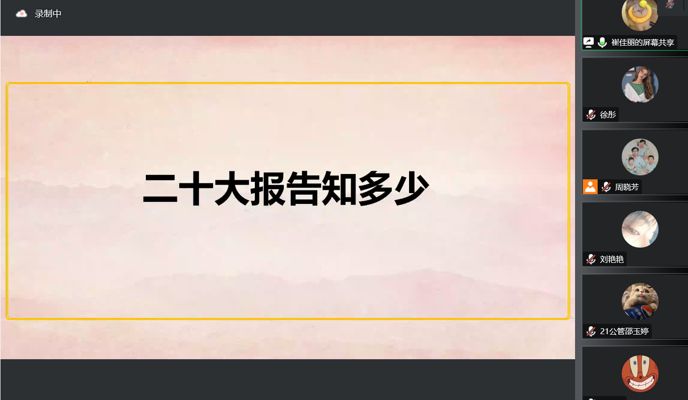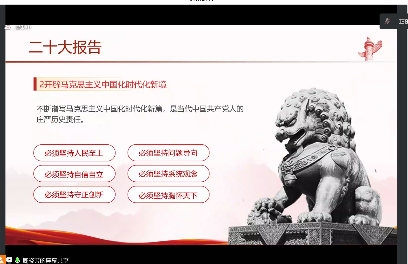周晓芳带领大家共同学习了党的二十大报告内容。党的二十大是在全党全国各族人民迈上全面建设社会主义现代化国家新征程、向第二个百年奋斗目标进军的关键时刻召开的一次十分重要的大会,是一次高举旗帜、凝聚力量、团结奋进的大会。党的二十大在政治上、理论上、实践上取得了一系列重大成果,就新时代新征程党和国家事业发展制定了大政方针和战略部署,是我们党团结带领人民全面建设社会主义现代化国家、全面推进中华民族伟大复兴的政治宣言和行动纲领。周晓芳重点分析了大会的主题及报告的主体框架和主要内容,对于同学们关注的教育、科技、人才等方面的内容与同学们展开热烈讨论,使各位党员同志和入党积极分子更加深入地掌握党的二十大报告的精髓。