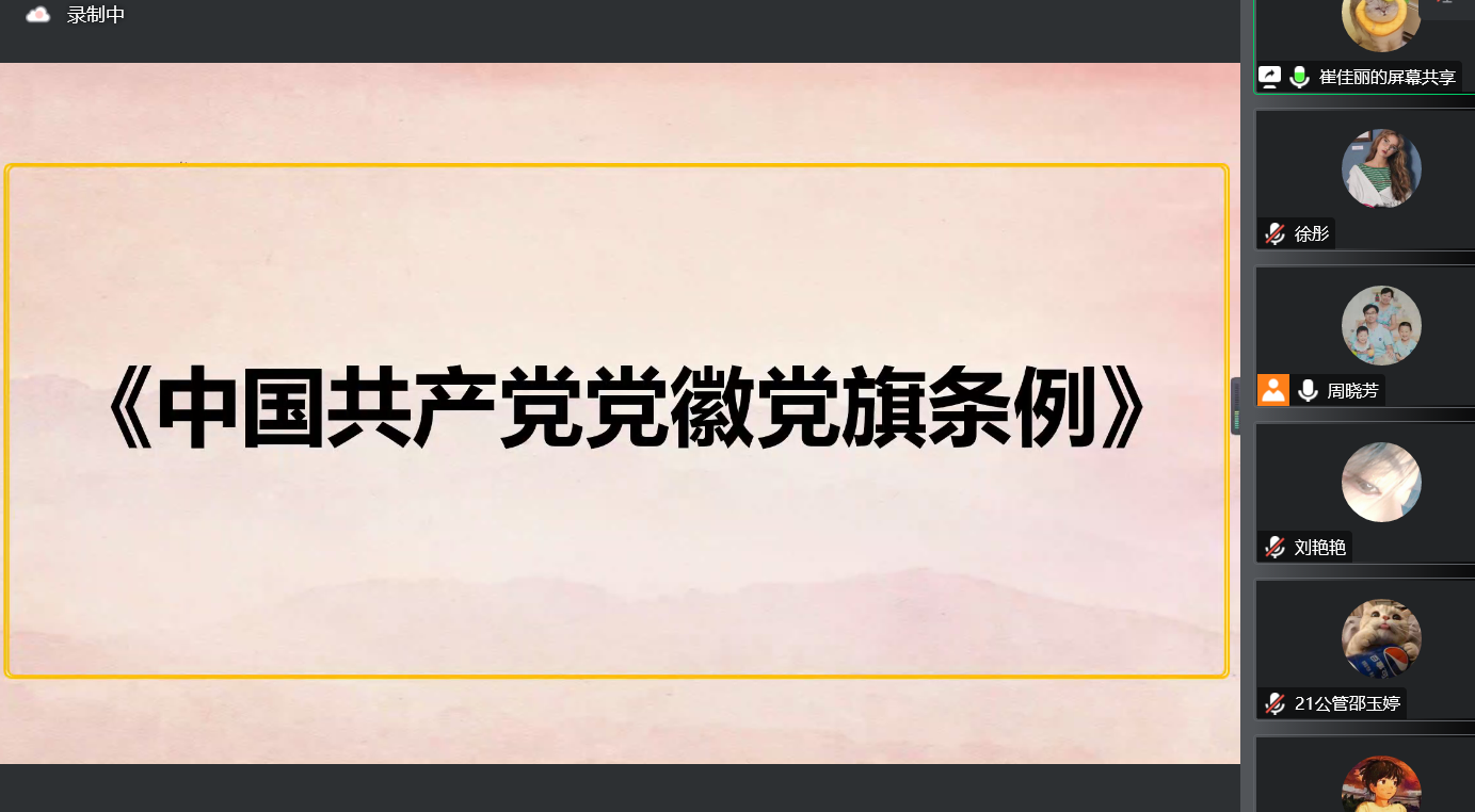 最后,洪嘉伟同学带领大家共同学习了《中国共产党党徽党旗条例》,对中国共产党党徽党旗的各项条例以及党徽党旗的使用和制作方式有了更加深入的了解。