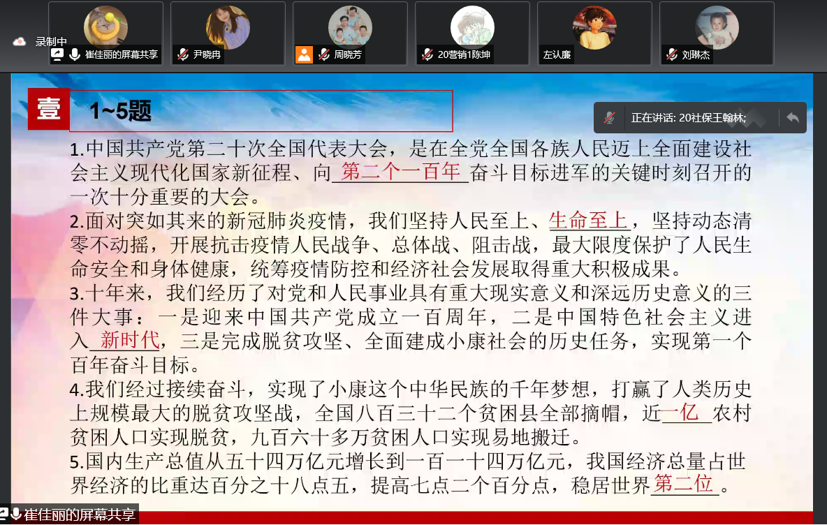 为进一步巩固学习内容,报告结束后参会人员扫码进行“党的二十大知多少”的答题活动,王翰林同学为大家揭晓答案并对相关题目进行了解析,进一步加深了大家对党的二十大报告的理解与掌握。